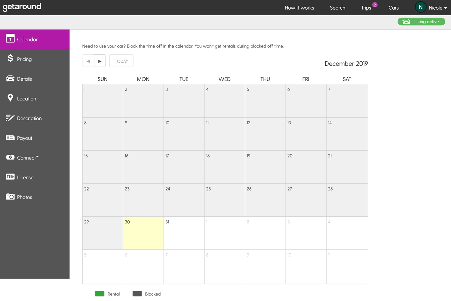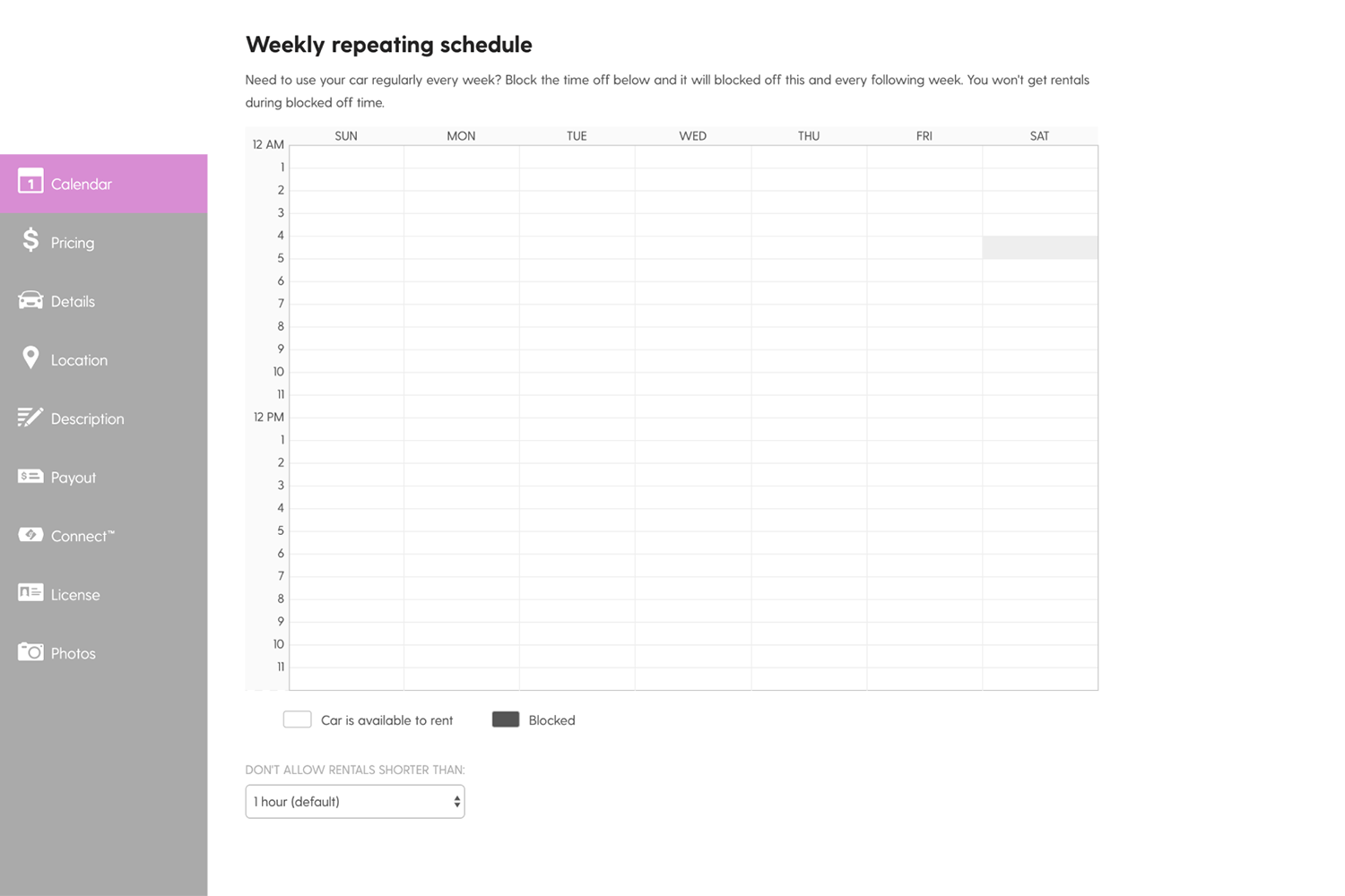 Managing vehicle availability is easy with Getaround's profile management tools. Hosts should proactively update vehicle calendars (you can set recurring time blocks) and optimize vehicle descriptions to increase booking opportunities and search availability.