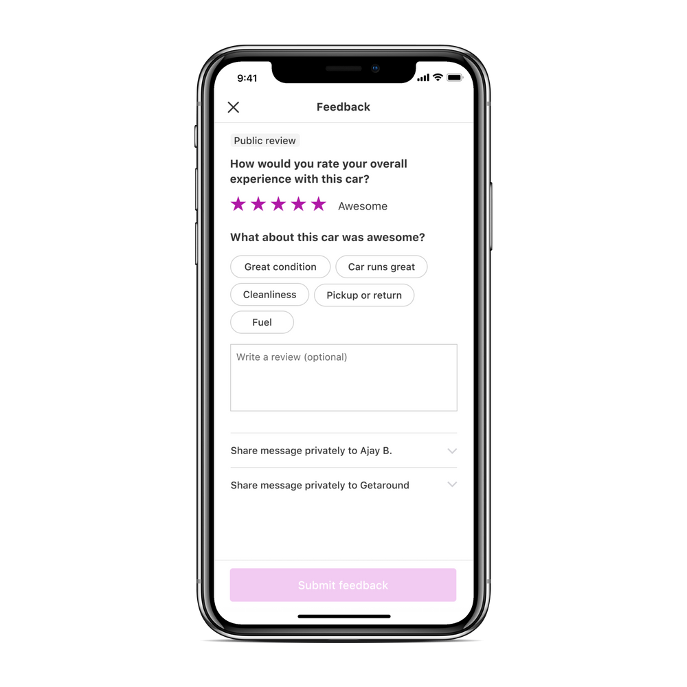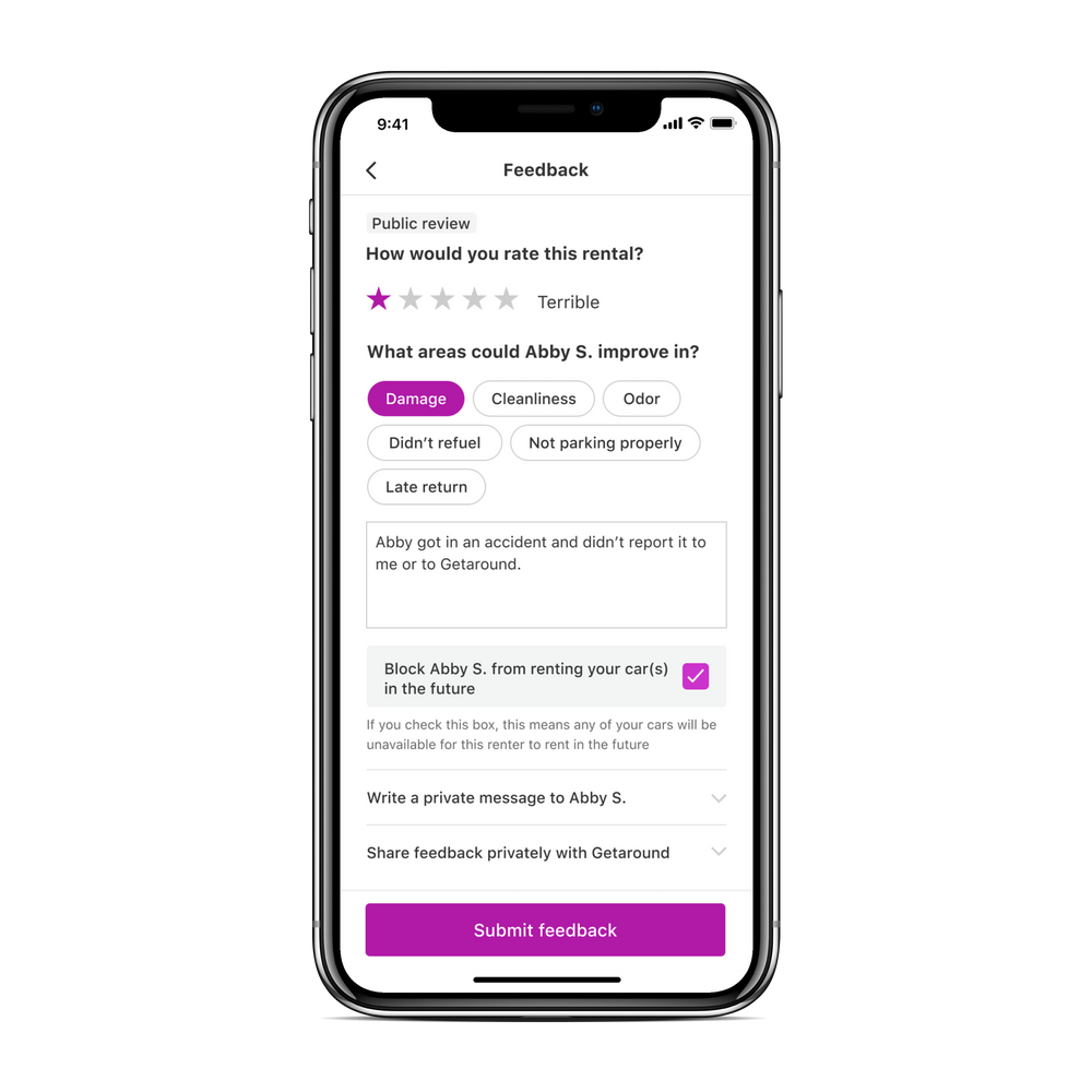Earlier this year we rolled out new prompts for car ratings and user feedback at the end of car share trips. Guests were given the option to rate their car on a 5-star scale and provide feedback on their vehicle experience (publicly, or privately to Getaround team only) up to seven days after their trip ends, and hosts gained the ability to distrust and block guests with whom they had a poor car sharing experience.